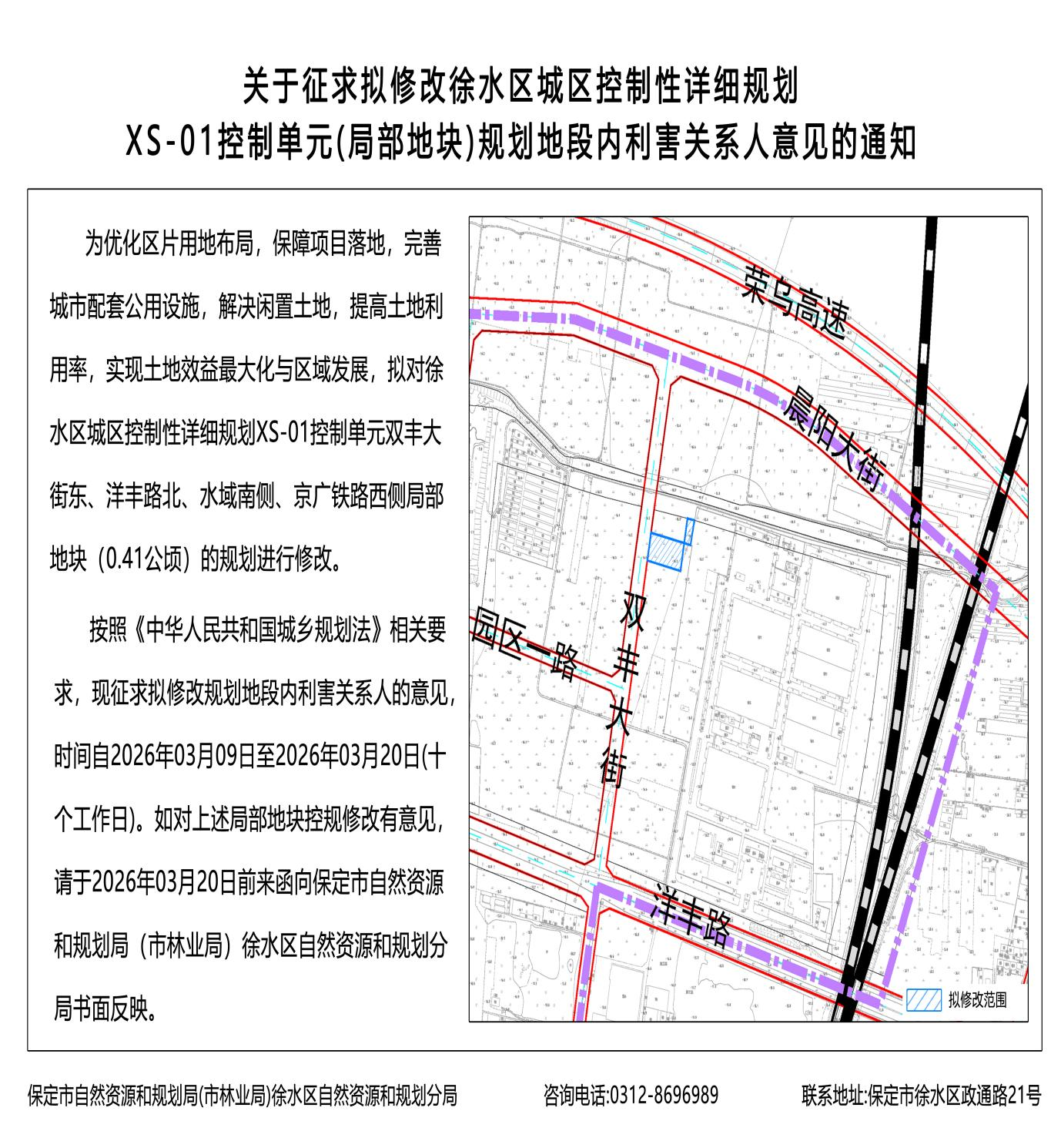 根据《中华人民共和国城乡规划法》相关要求,现征求拟修改规划地段内利害关系人的意见,时间自2026年3月9日至2026年3月20日(十个工作日)。如对上述地块控规规划修改有意见,请于2026年3月20日前来函向保定市自然资源和规划局(市林业局)徐水区自然资源和规划分局书面反映,并提供产权证明相关资料。