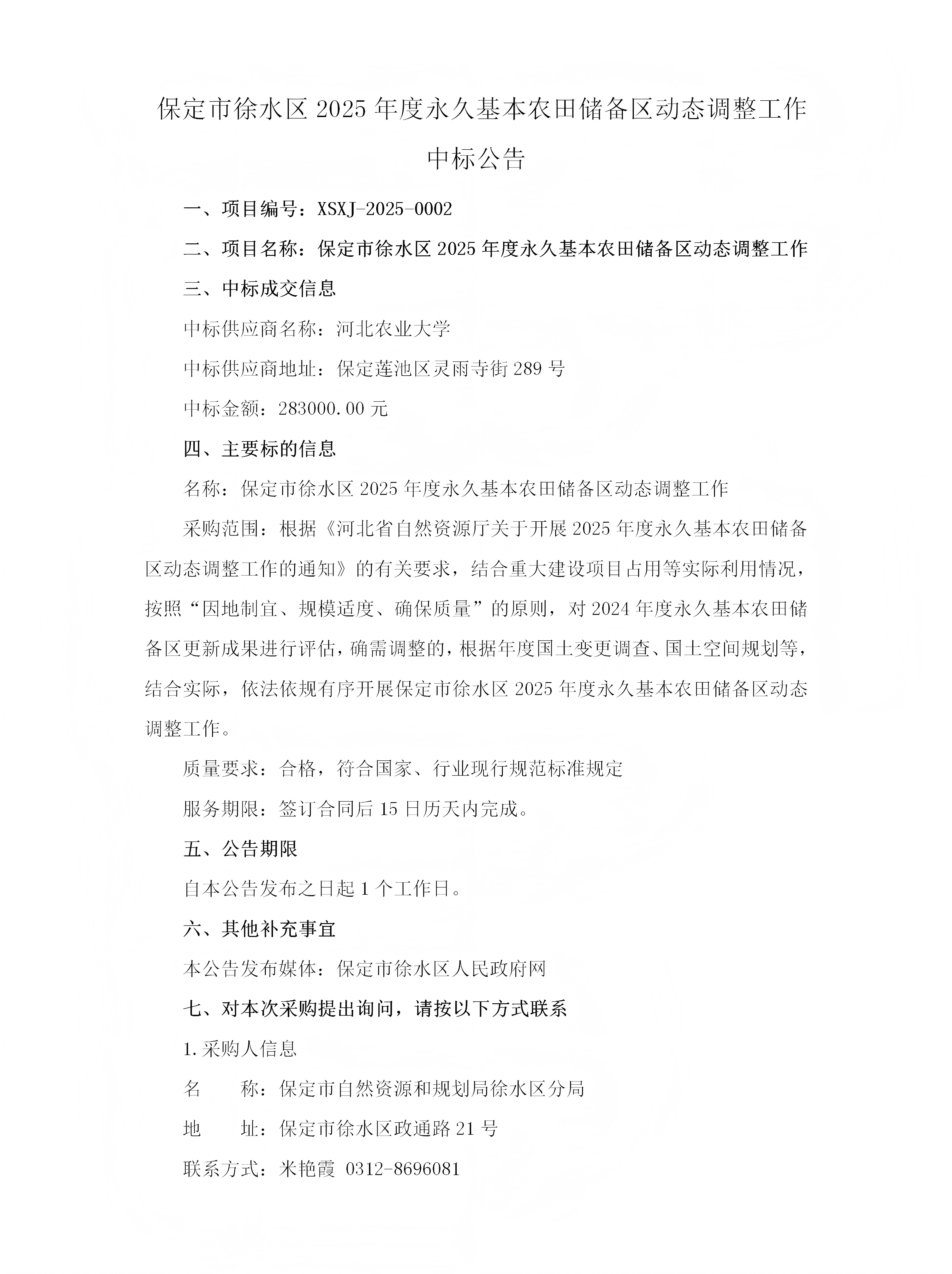 保定市徐水区2025年度永久基本农田储备区动态调整工作项目中标公告