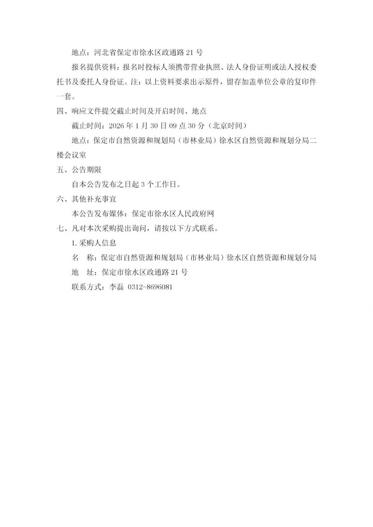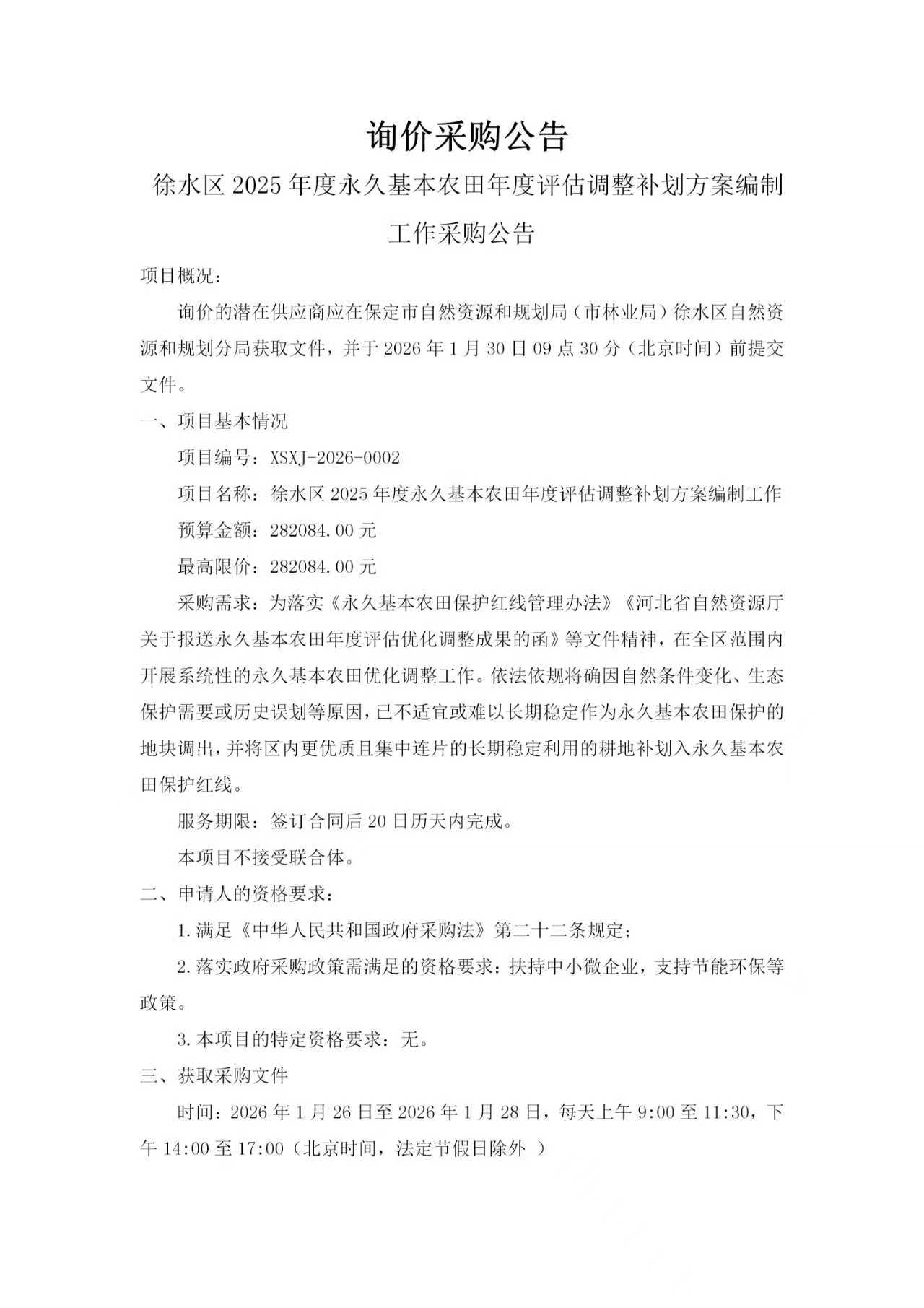 徐水区2025年度永久基本农田年度评估调整补划方案编制工作采购公告