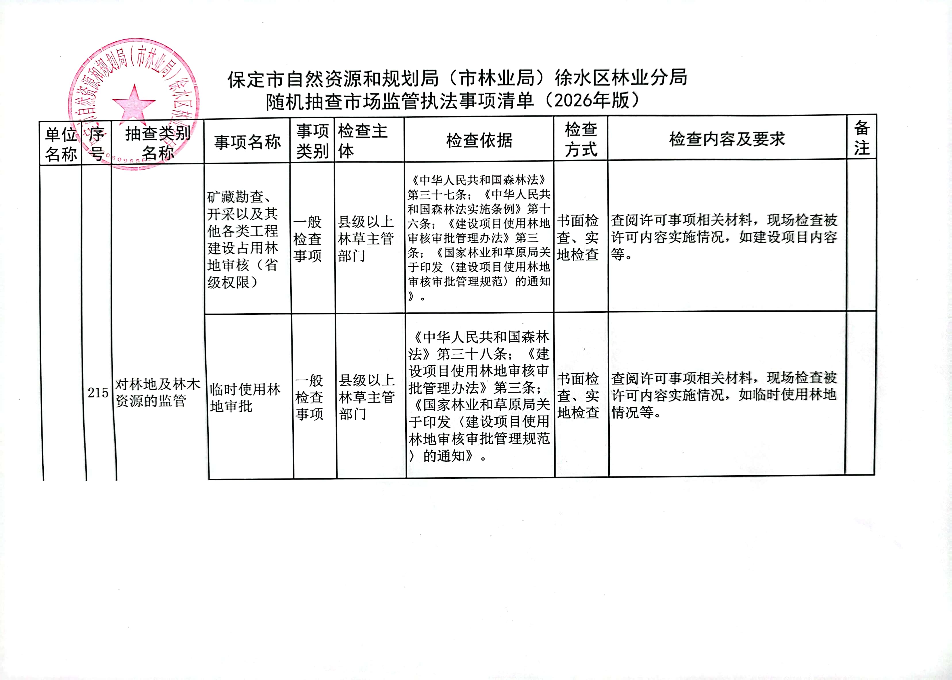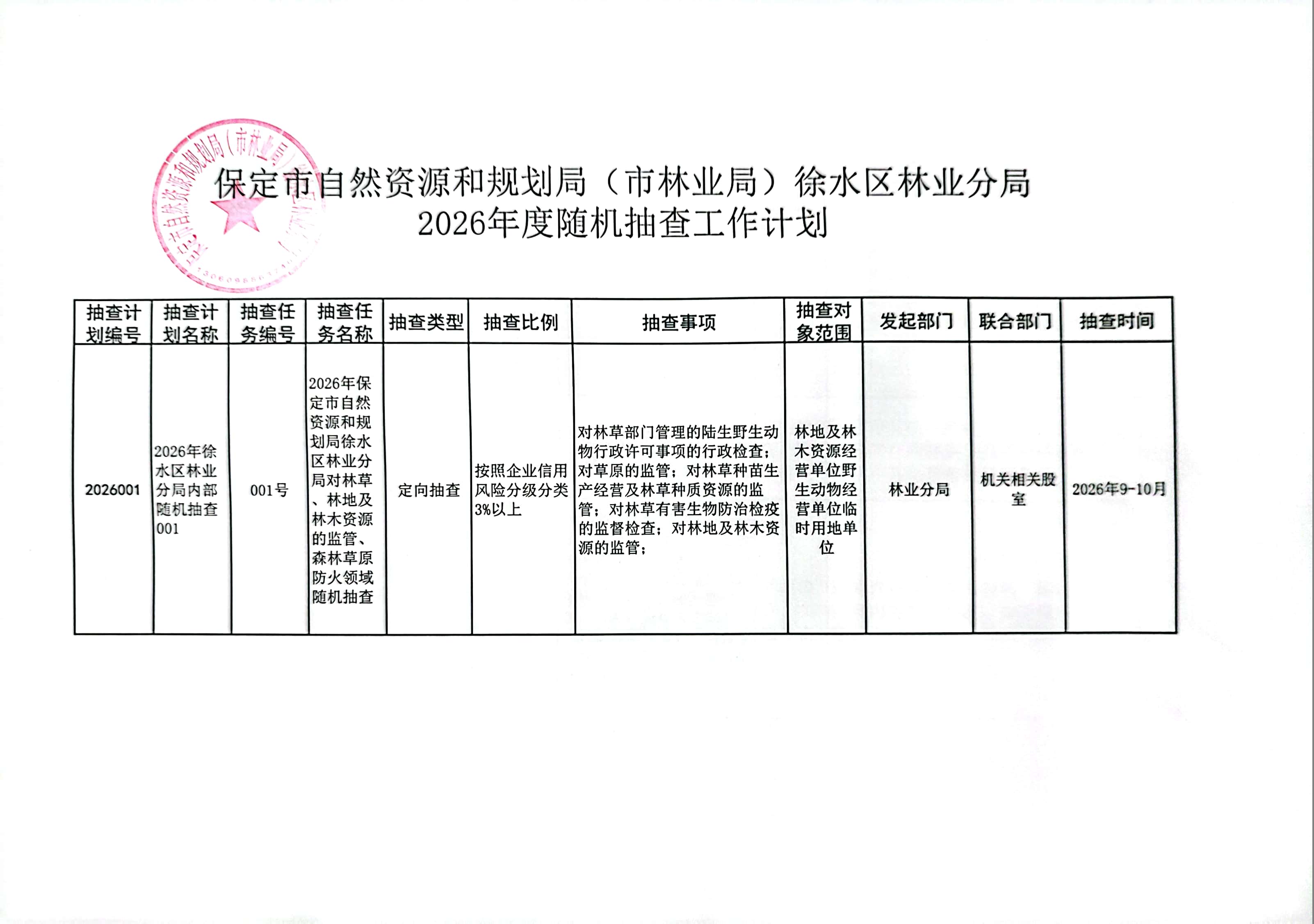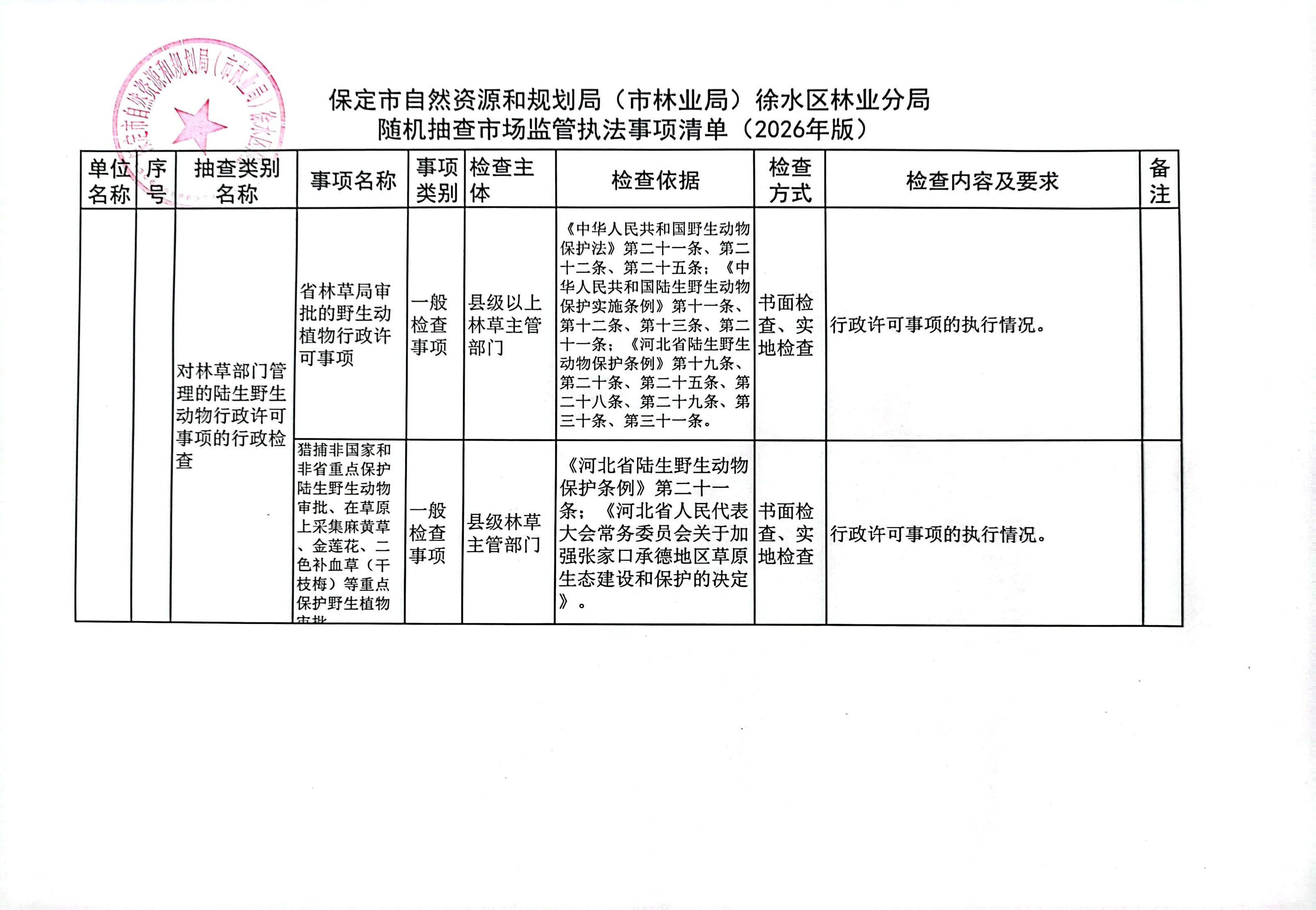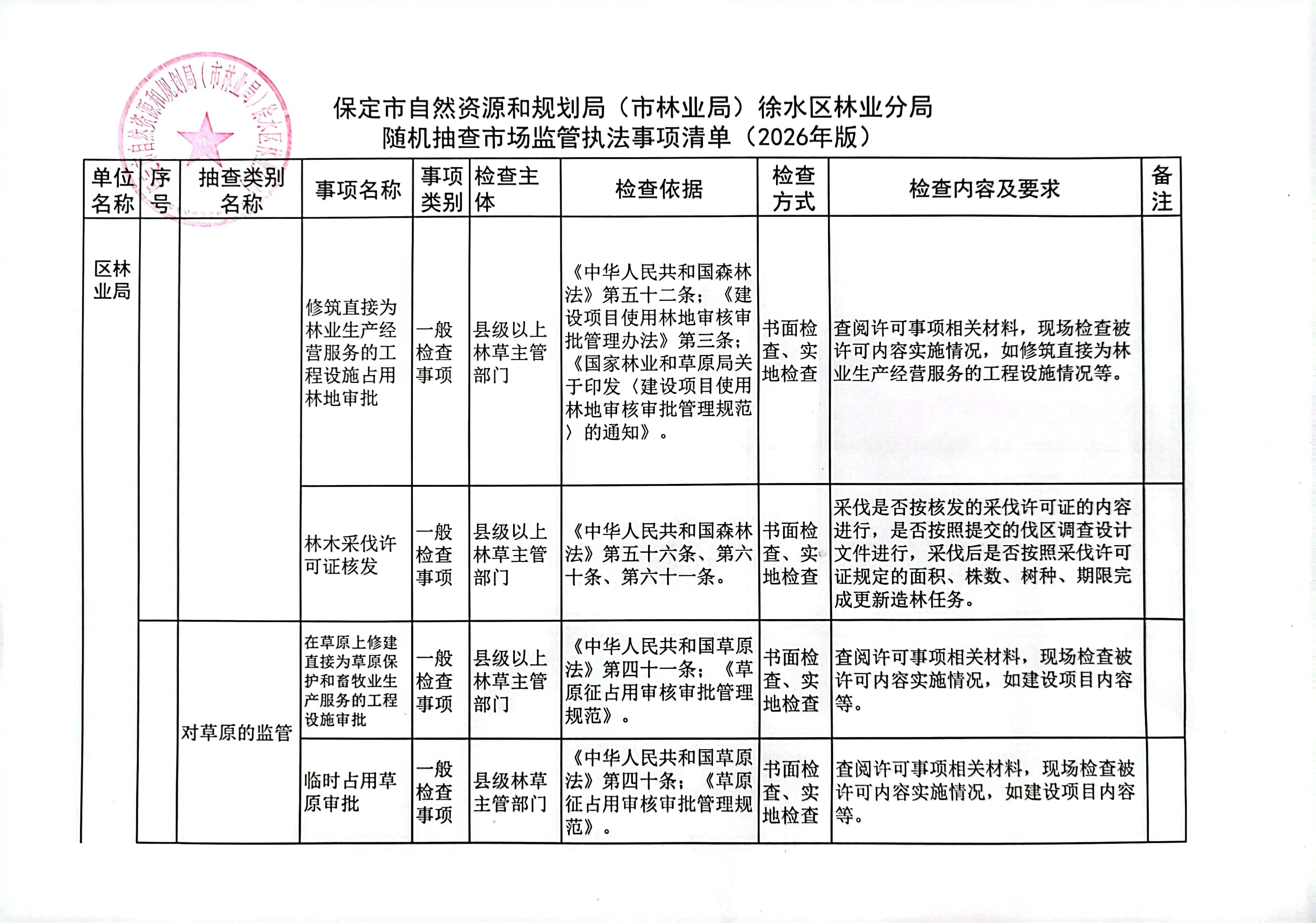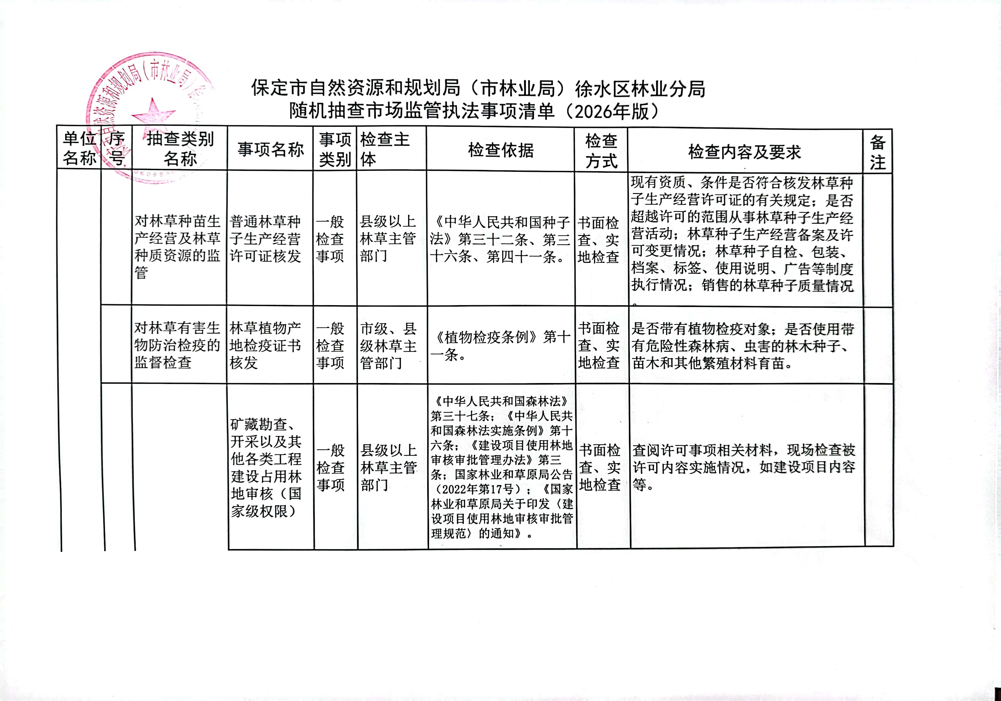 保定市自然资源和规划局(市林业局)徐水区林业分局2026年度随机抽查工作计划及事项清单