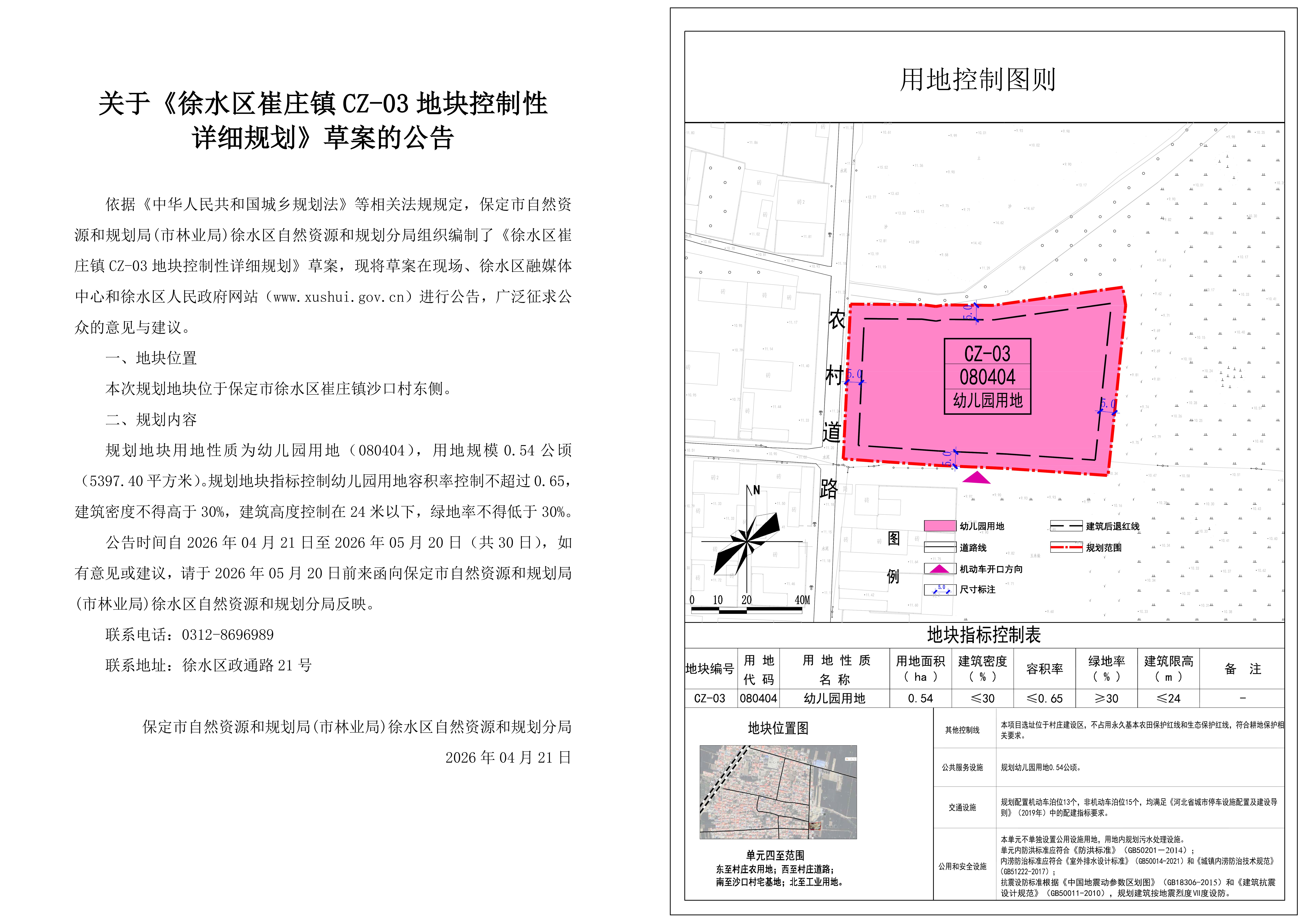 依据《中华人民共和国城乡规划法》等相关法规规定,保定市自然资源和规划局(市林业局)徐水区自然资源和规划分局组织编制了《徐水区崔庄镇CZ-03地块控制性详细规划》草案,现将草案在现场、徐水区融媒体中心和徐水区人民政府网站(www.xushui.gov.cn)进行公告,广泛征求公众的意见与建议。