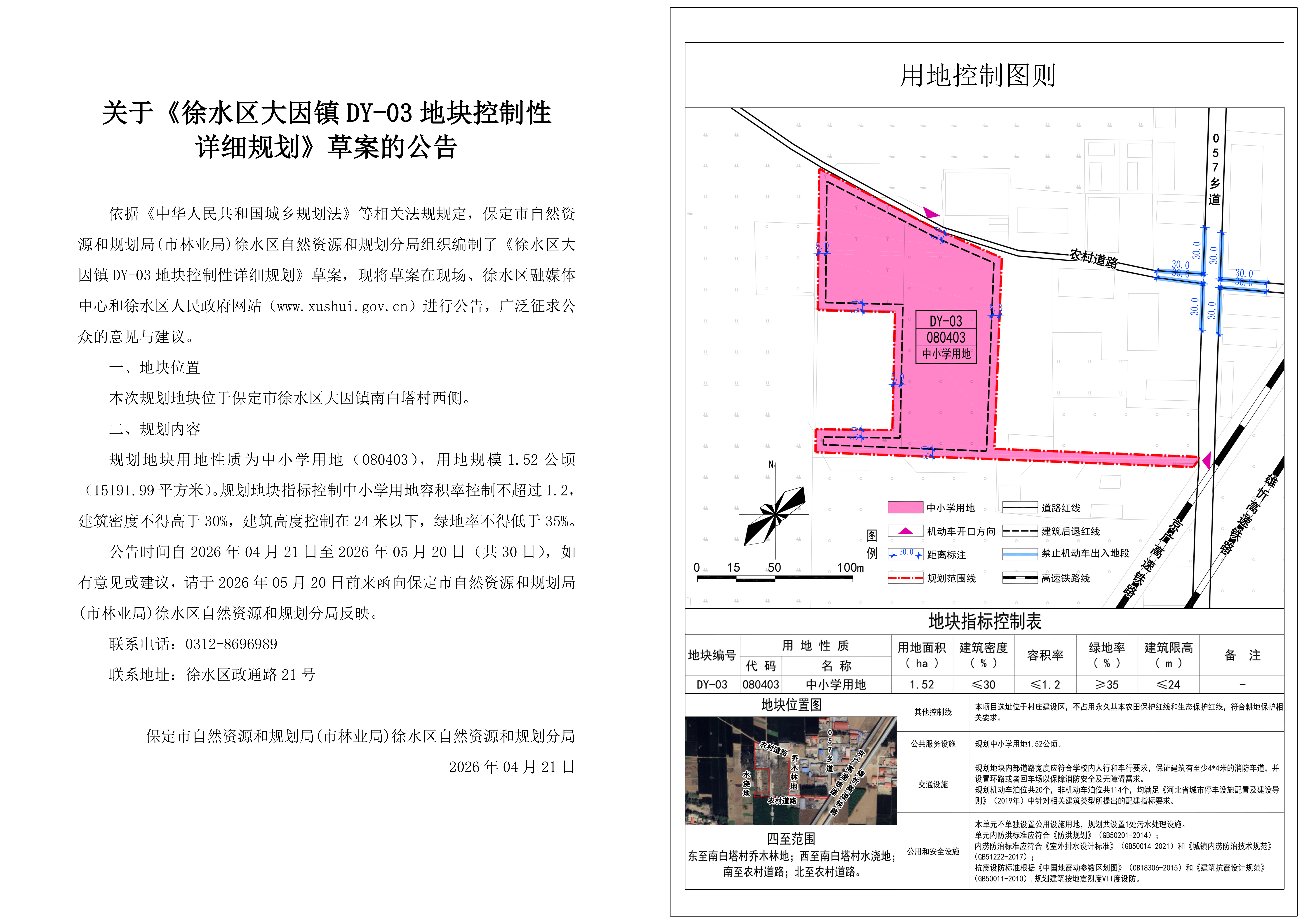 保定市自然资源和规划局(市林业局)徐水区自然资源和规划分局关于《徐水区大因镇DY-03地块控制性详细规划》草案的