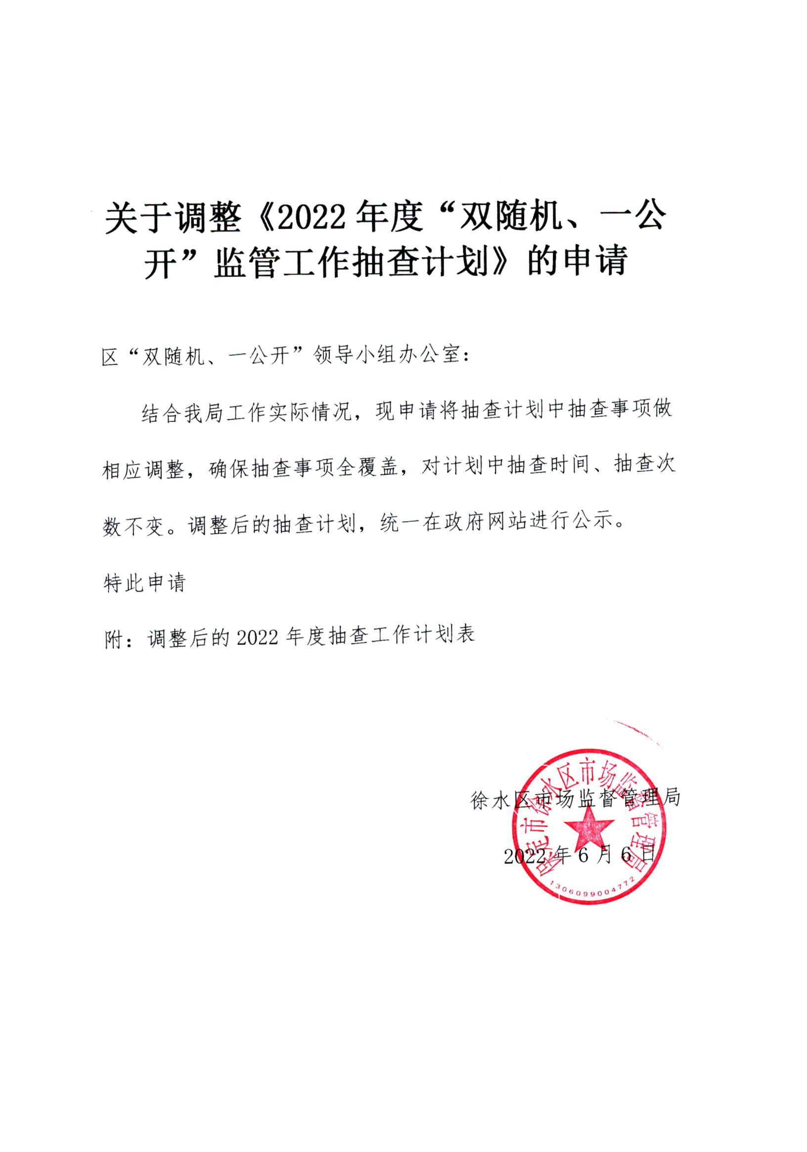 徐水区市场监督管理局关于调整“双随机、一公开”抽查工作计划的申请
