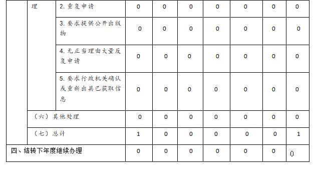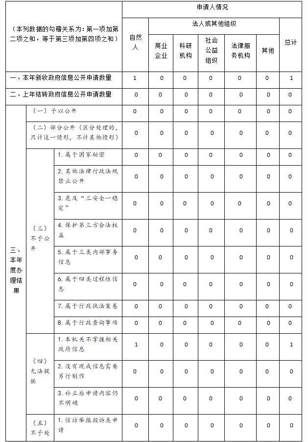 本报告依据《中华人民共和国政府信息公开条例》和《中华人民共和国政府信息公开工作年度报告格式(试行)》要求,由徐水区人民政府综合全区各部门和各乡镇政府信息公开工作年度报告和统计数据编制而成。全文包括总体情况、主动公开政府信息情况、收到和处理政府信息公开申请情况、政府信息公开行政复议和行政诉讼情况、存在的主要问题及改进情况、其他需要报告的事项等六部分组成。本年度报告中所列数据的统计期限自2019年1月1日起,至2019年12月31日止。 一、总体情况 (一)强化组织领导,保障信息公开有效开展 我区高度重视政务公开工作,认真贯彻落实国家、省关于政务公开的一系列要求和部署,区政府主要负责同志组织召开政府常务会,研究部署政务公开工作,明确区委常委、常务副区长分管政务公开工作。成立徐水区推进政务公开暨“互联网+政务服务”工作领导小组,由政府主要负责同志任组长,推进政务公开工作深入开展。 (二)健全工作机制,加强信息公开管理 一是认真贯彻落实新修订的《中华人民共和国政府信息公开条例》,先后印发了《保定市徐水区人民政府办公室关于做好当前政务公开有关工作的通知》、《保定市徐水区2019年政务公开工作要点》、《保定市徐水区政务公开办公室关于做好2019年度政务公开考核工作的通知》、《保定市徐水区承担市2019年政务公开工作考核指标任务分解表》等一系列文件,明确工作重点,细化责任分工,规范工作流程。二是加强对政府信息公开工作的日常指导和监督检查。我区新一轮机构改革完成后,部分单位和部门职能分工发生了调整,为进一步做好政务公开衔接工作,我区印发了《保定市徐水区人民政府办公室关于做好当前政务公开有关工作的通知》,指导各有关单位做好政府信息公开工作。三是对政务公开工作人员进行定期培训。为进一步提高全区政务公开工作人员的思想认识和业务水平,组织学习新修订的《中华人民共和国政府信息公开条例》并举办政务公开专题培训班1期。四是建立健全政府信息公开工作考核制度。为切实做好政府信息公开工作,我区制定了徐水区政务公开工作考核制度。 (三)完善平台建设,拓展信息公开渠道 一是进一步推进“互联网+政务服务”建设,不断强化政府网站信息发布功能,充分发挥政府门户网站公开政府信息的主渠道作用,在政府网站开设“信息公开平台”专栏、“扶贫脱贫”、“财政预决算”、“人大工作”等专栏,主动公开各类政府信息,发布政策解读。二是进一步推进政府信息公开平台与政务服务平台的融合,更新调整了政务服务事项829项,其中762项可全程在线办理,并在政府网站信息公开栏目发布了《保定市徐水区政务服务事项目录清单》。在河北政务服务网(徐水区)积极编制政务服务事项办事指南,公开政务服务事项基本信息、办理流程、办理结果等信息,并根据事项信息的变动实时更新事项相关信息。三是进一步加强政务新媒体平台建设。区政府开通政府官方微博“徐水在线365”,2019年发布政务微博200余条,关注量达27743人。同时做好全区政务新媒体的日常监管工作,印发了《保定市徐水区人民政府关于对政务新媒体自查的紧急通知》,转发了《保定市人民政府办公室关于全市“两微一端”登记备案的通知》、《保定市两微一端统一备案申报表》。 (四)全力做好主动公开和依申请公开工作 按照《中华人民共和国政府信息公开条例》规定,编制并公开2019年政府信息公开指南、政府信息公开目录,在政府门户网站信息公开专栏设置信息公开年报。全年通过政府信息公开平台公开政府信息1232条。2019年,我区共收到信息公开申请1件, 属自然人信函申请。上年结转信息公开申请0件,本年度办结信息公开申请1件,结转下年度继续办理0件。 二、主动公开政府信息情况 三、收到和处理政府信息公开申请情况 四、政府信息公开行政复议、行政诉讼情况 五、存在的主要问题及改进情况 (一)存在问题 一是部分部门对政务公开工作重视程度不够;二是政务公开工作人员业务能力有待提高;三是政府信息公开形式需要进一步优化。 (二)改进情况 一是进一步增强政务公开意识。切实提高工作主动性、自觉性,明确责任,强化举措,专人专岗抓好工作落实,确保信息公开工作取得实效。二是进一步提高政务公开能力。通过加强业务学习和培训,提高工作人员的业务水平,进一步规范政务公开工作流程,使政务公开工作更具规范化、标准化。三是进一步加大政务公开力度。坚持以公开为常态、不公开为例外,深入推进决策公开、执行公开、管理公开、服务公开、结果公开和重点领域信息公开。做好政策解读和依申请公开,做到“应公开、尽公开”。四是进一步拓宽政务公开范围。丰富公开形式,依托政府网站和政务微博,推动政务新媒体健康有序发展,以多种形式提升公开效果。 六、其他需要报告的事项 无
