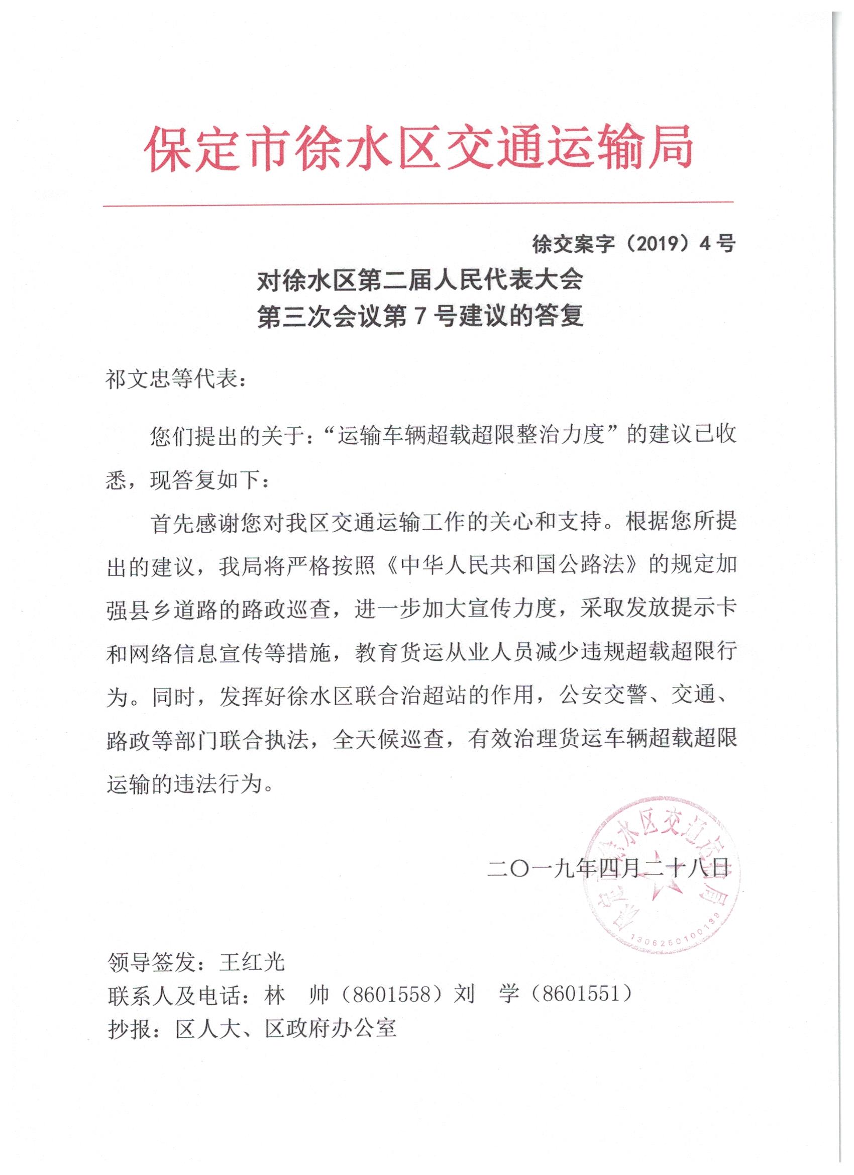 保定市徐水区交通运输局对徐水区第二届人民代表大会第三次会议第7号建议的答复
