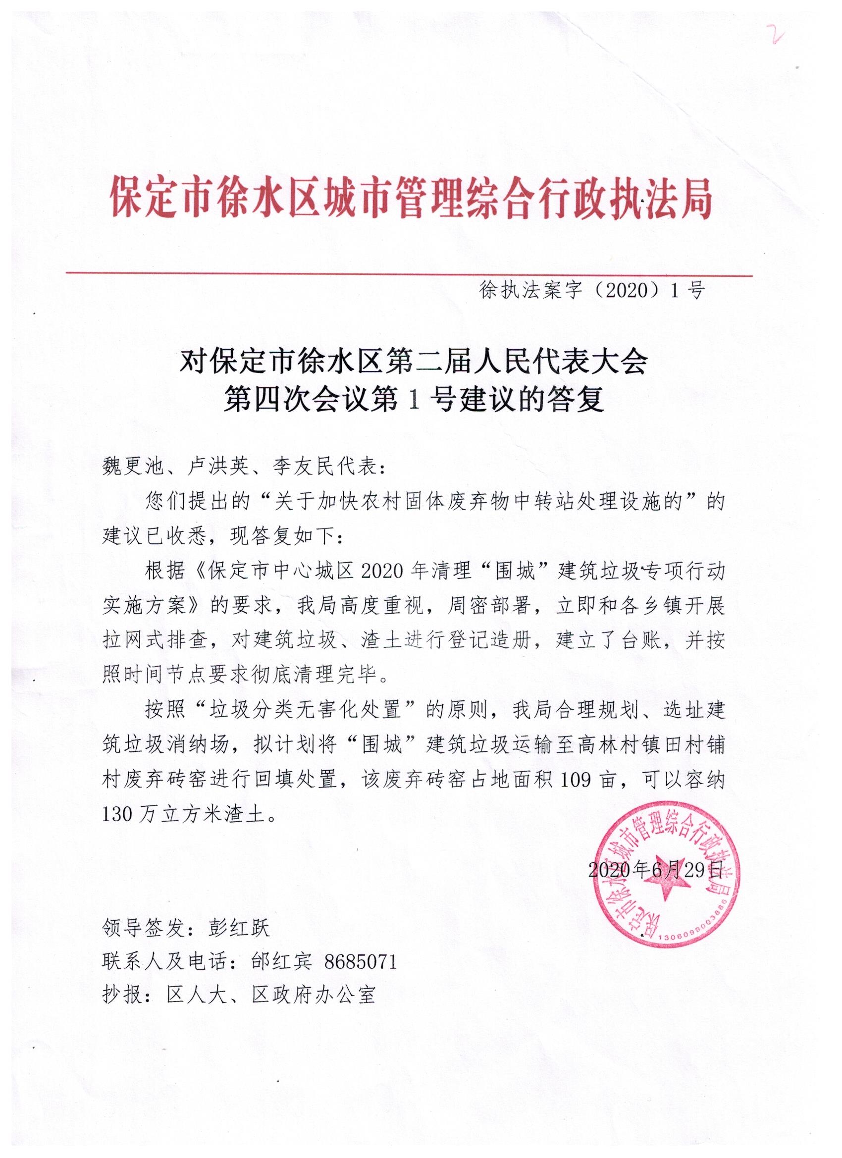 对保定市徐水区第二届人民代表大会第四次会议第1号建议的答复