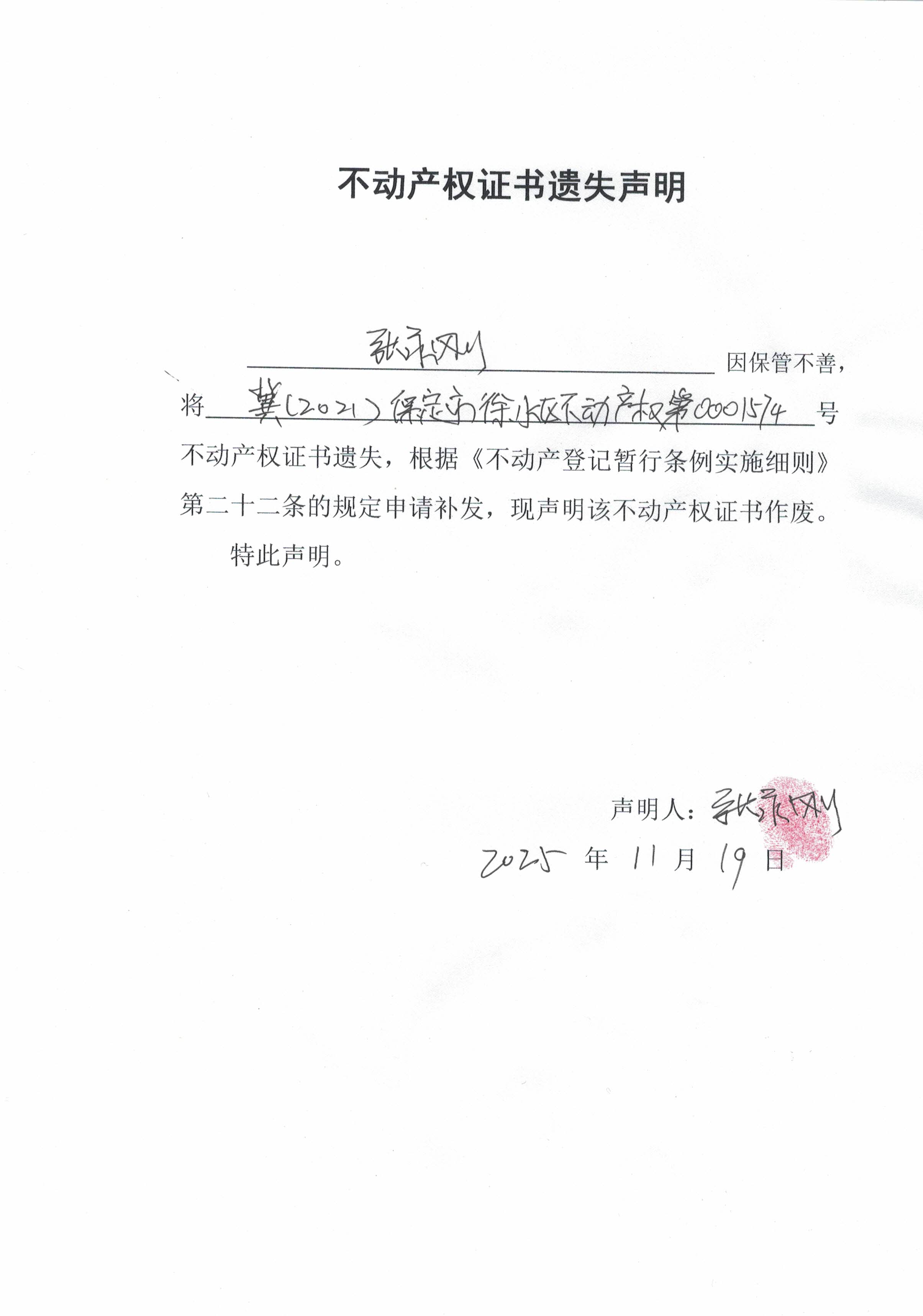 不动产权证书遗失声明