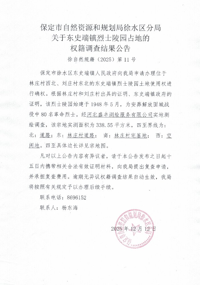 关于东史端镇烈士陵园占地的权籍调查结果公告