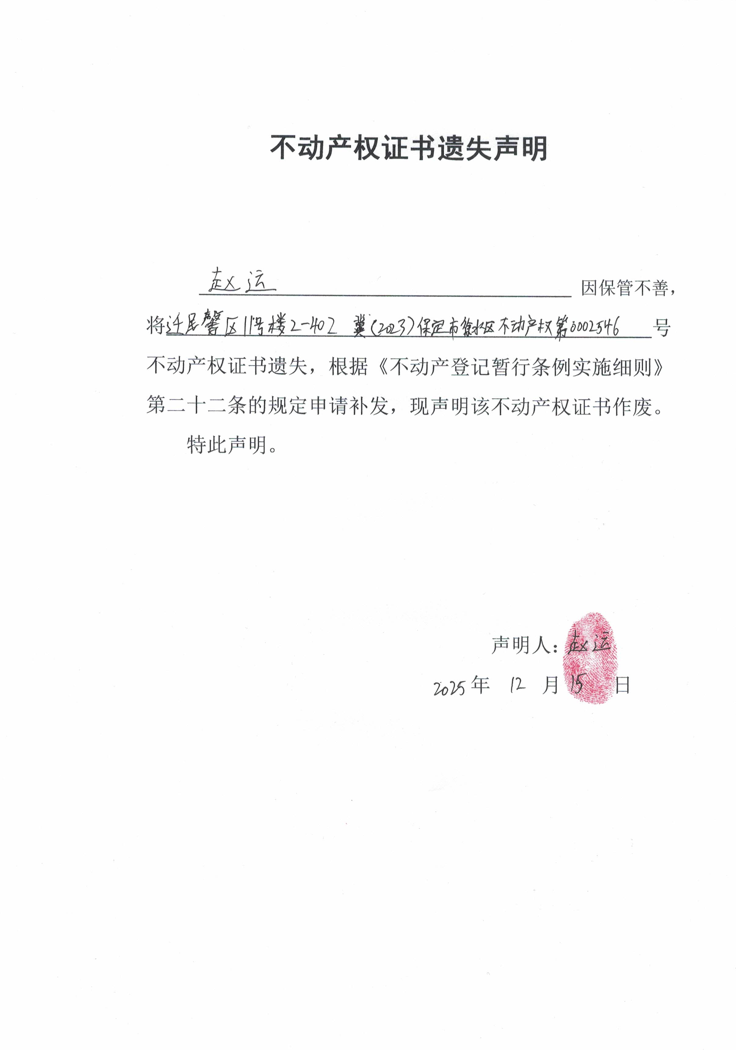 不动产权证书遗失声明
