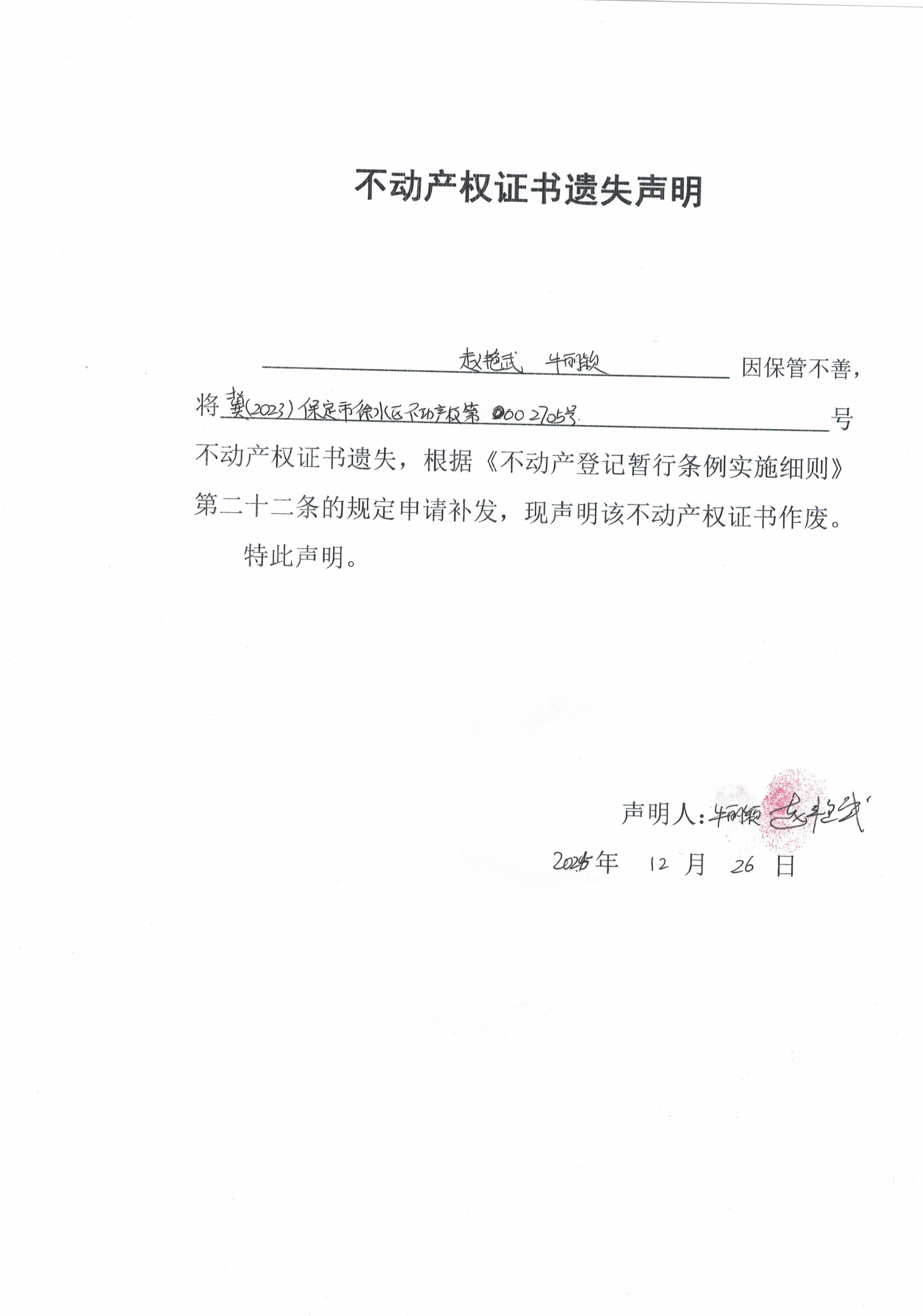 不动产权证书遗失声明