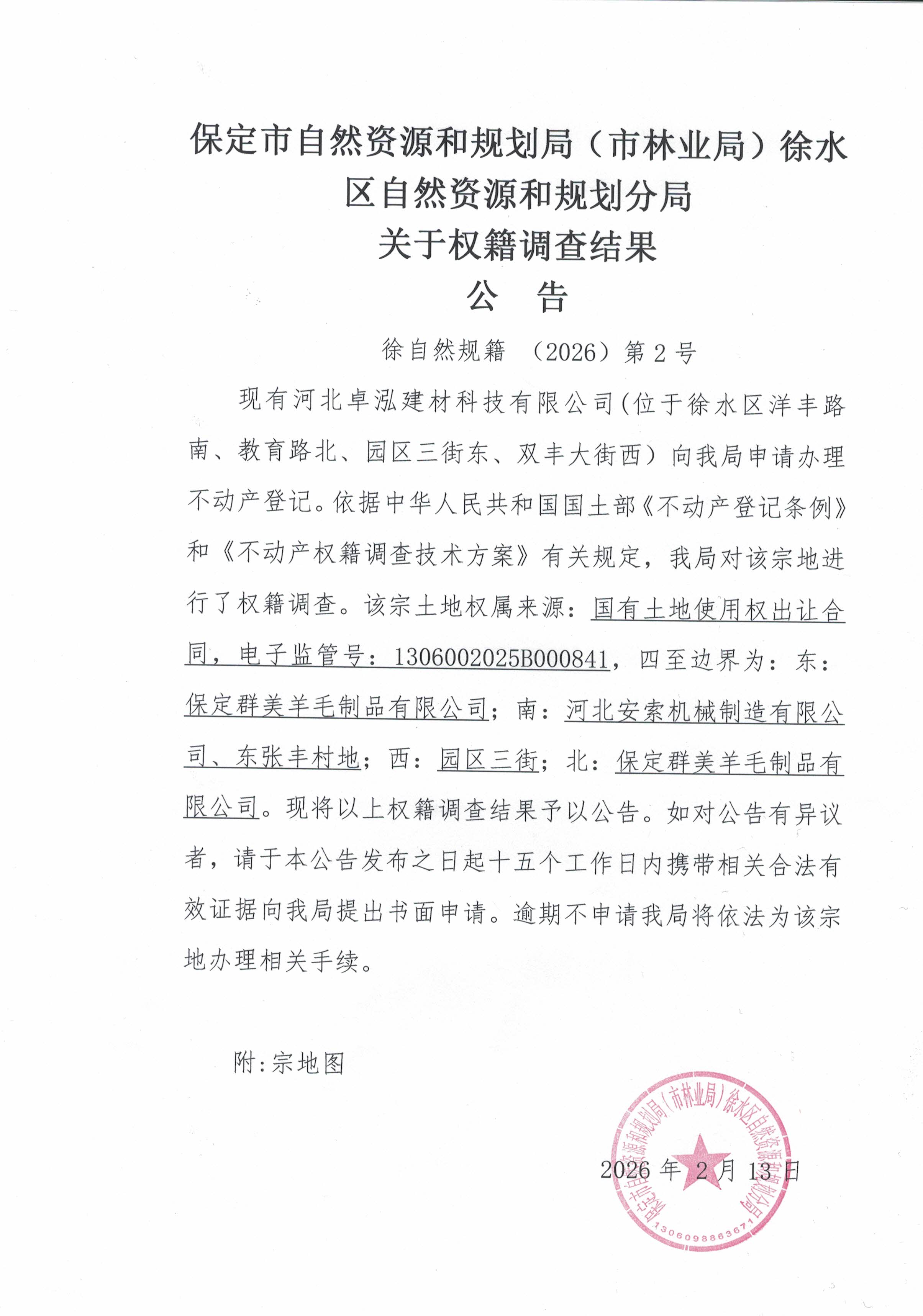 保定市自然资源和规划局(市林业局)徐水区自然资源和规划分局关于权籍调查结果公告