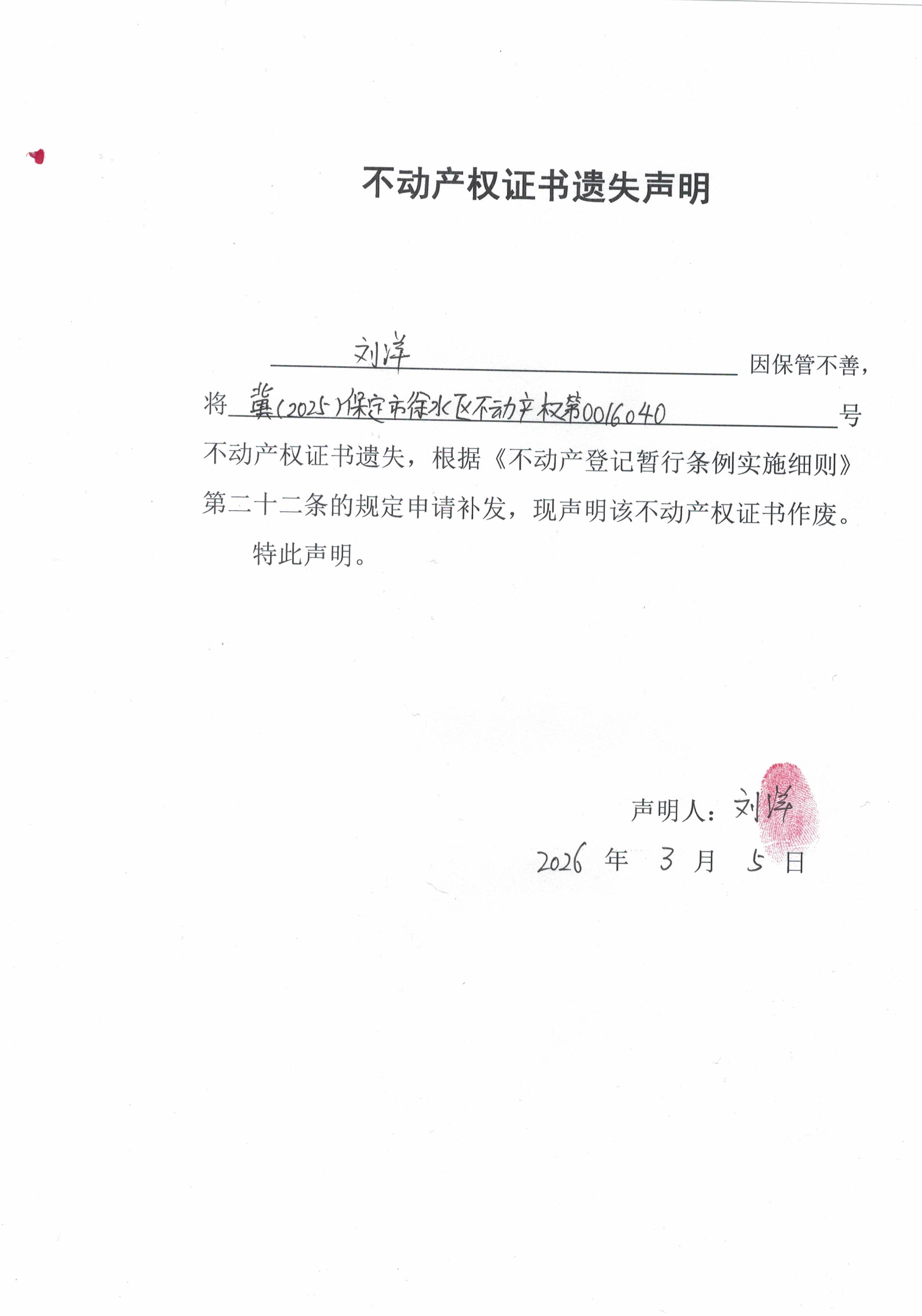 名  称: 不动产权证书遗失声明