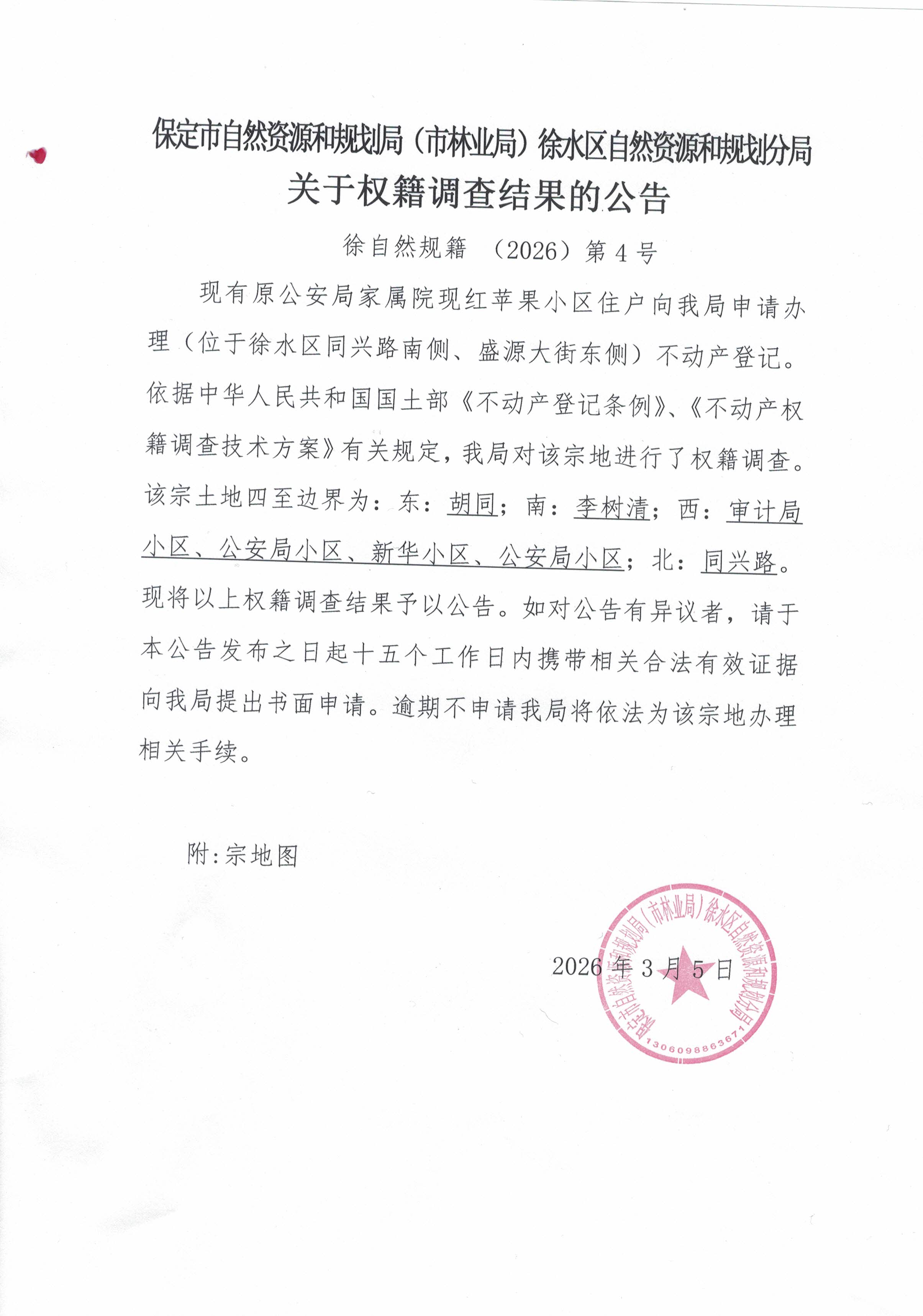 保定市自然资源和规划局(市林业局)徐水区自然资源和规划分局关于权籍调查结果的公告